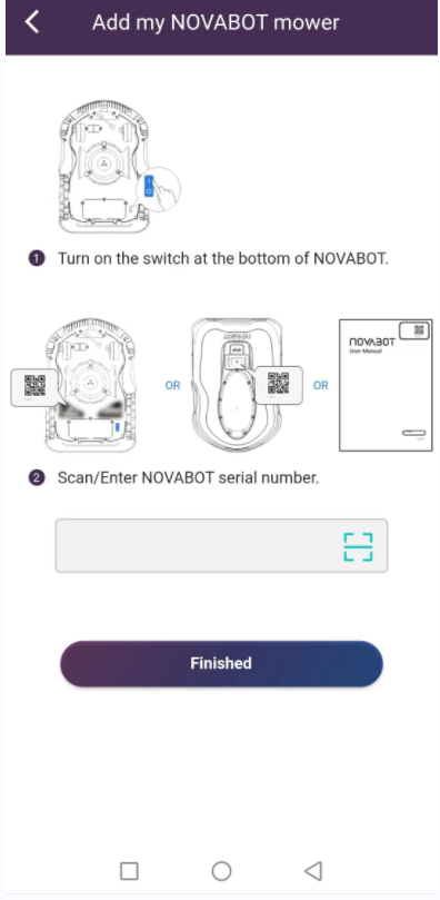 Step 2: Connect Novabot to your account. (Click button on the mower screen, choose About can also find the mower's QR code and SN)