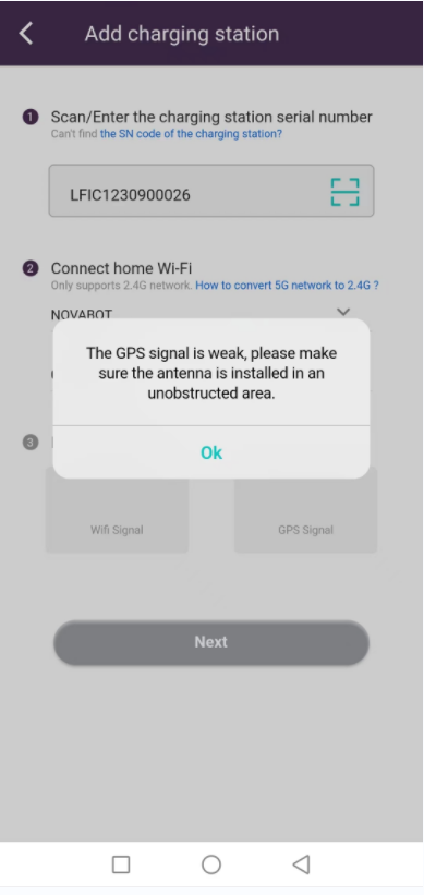 3.Please reconnect the charging station to the top of the GNSS antenna if the error message appears. It may take 1-2 minutes to complete. If they do not meet the requirements at last, you need to adjust your station location.Once the Wi-Fi signal and GPS coordinates are verified.(If you move the antenna or charging pile after this, you will need to re-add the charging pile and input the WIFI again.)