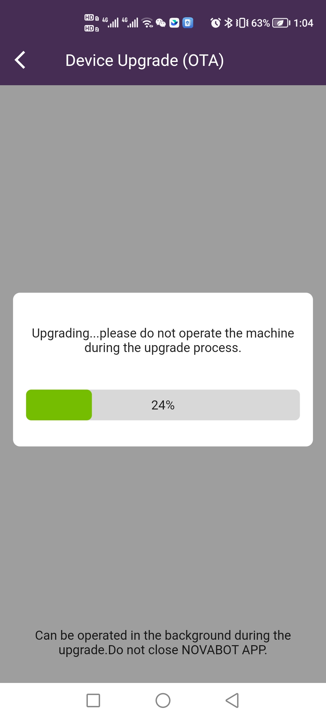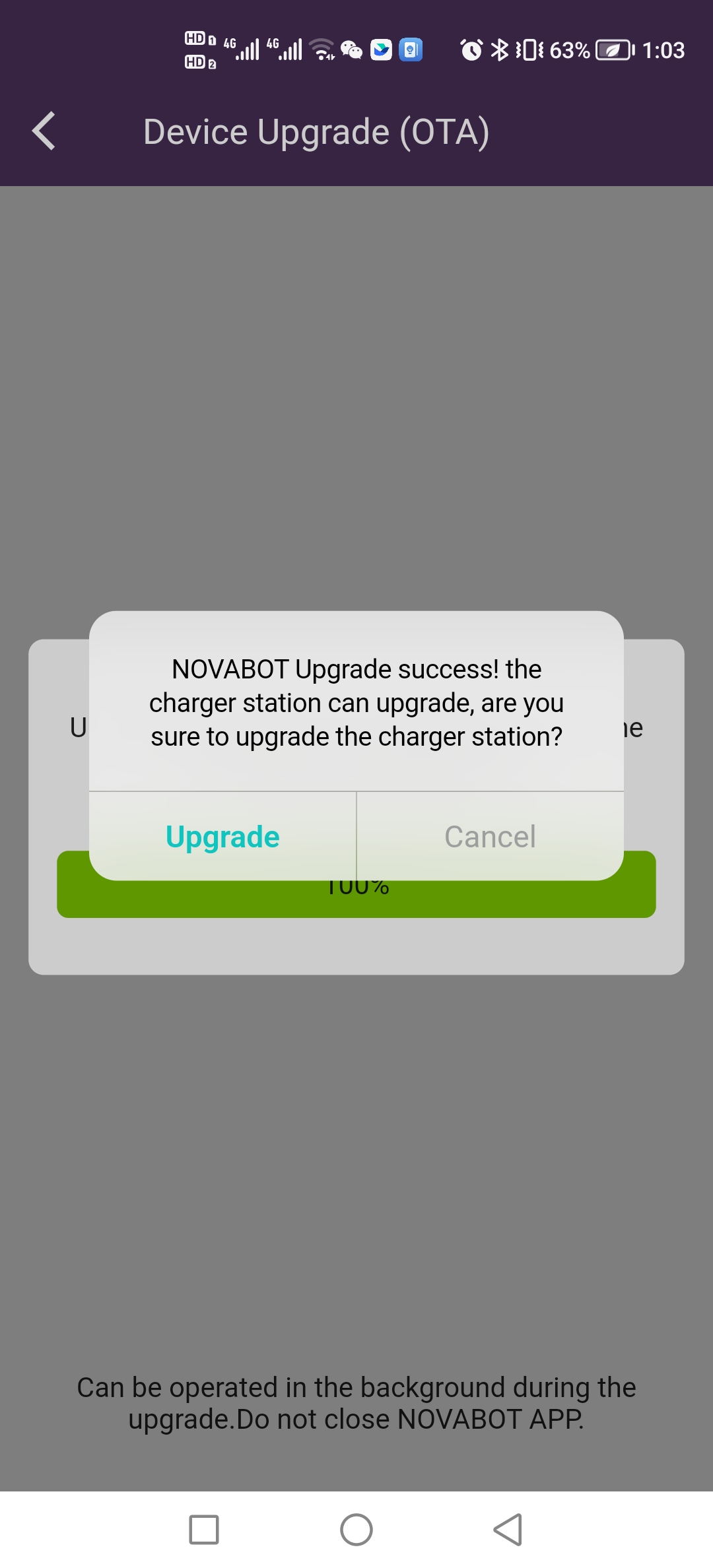 4.FInd 'NOVABOT Device Upgrade(OTA) in path "Profile --> Setting -->About', press ok to start updating. (The Novabot model in the pic below is for reference only)