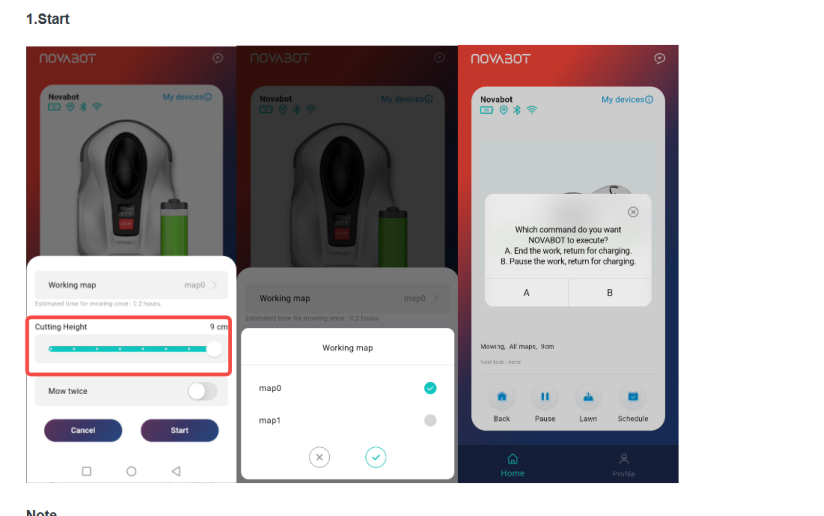 6.Pull the mower out of the charging station and restart it. Unplug the charging station and plug it back in. Then, place the mower back into the charging station and click start to begin mowing.